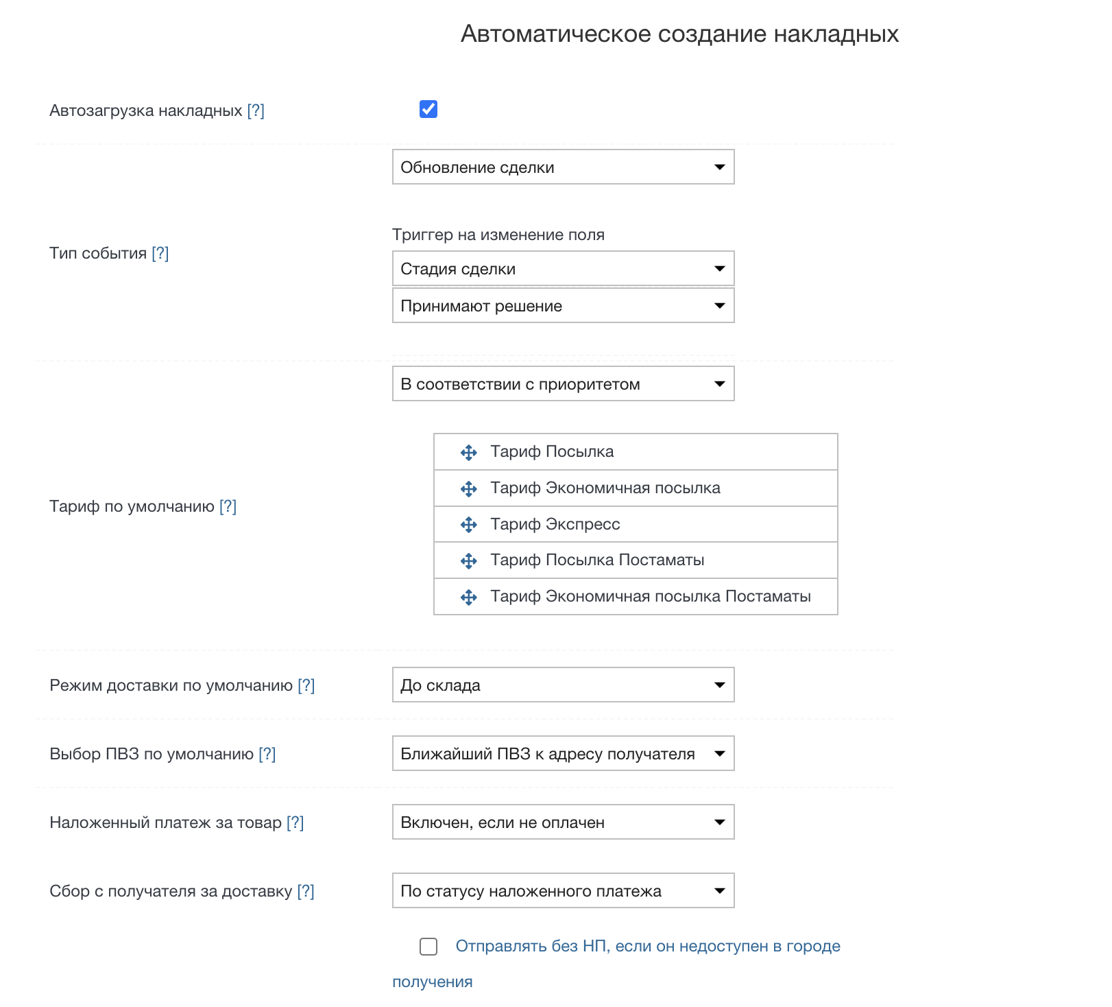 При выборе необходимо указать стадию сделки, которая будет служить триггером автоматического создания накладной СДЭК.