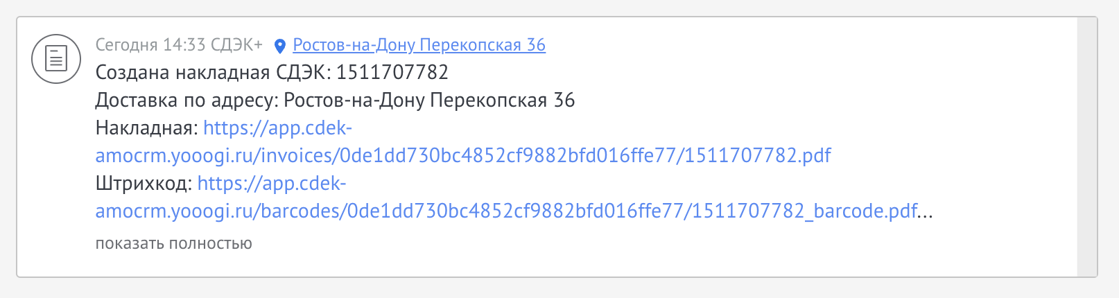 Опция добавит сообщение о создании накладной с ссылками на накладную и штрихкоды накладной ленту событий сделки: