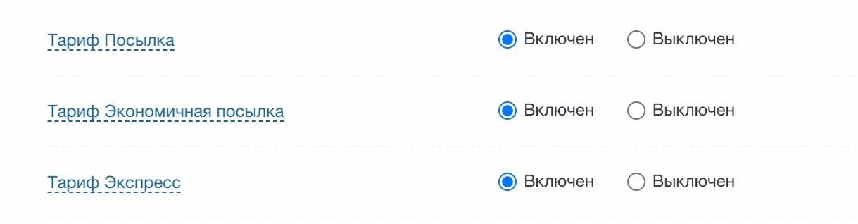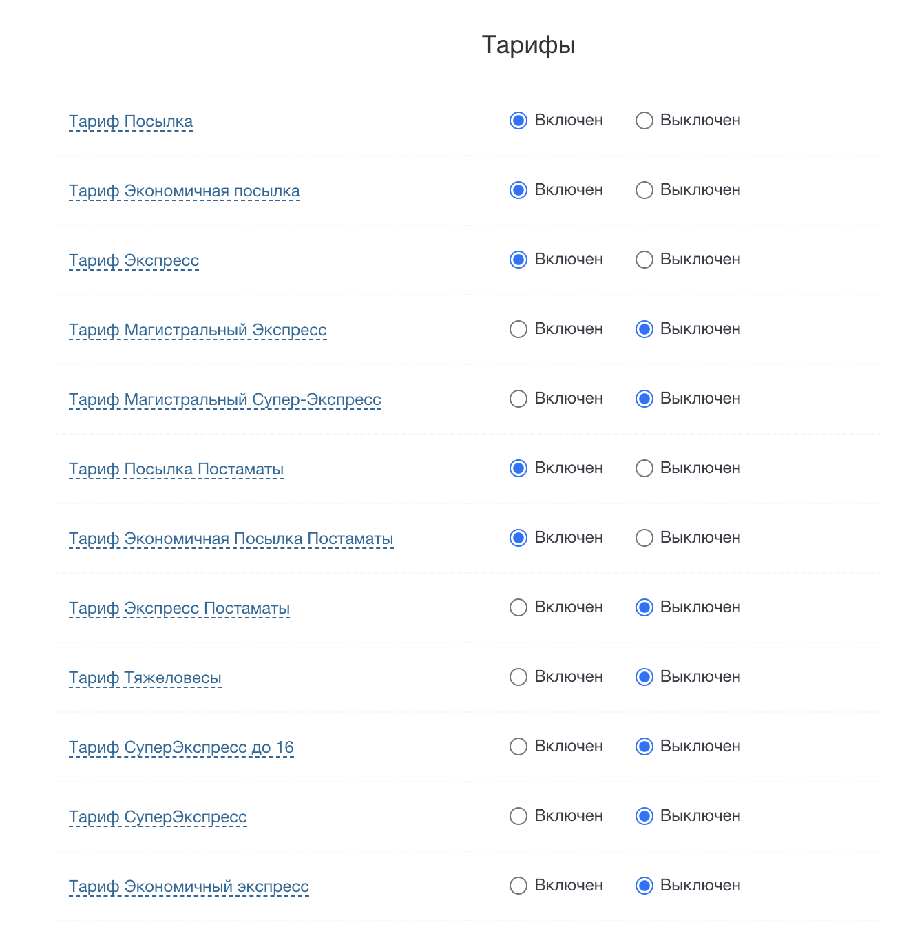 В данном разделе пользователь может включить нужные тарифы для расчета. Стоит заметить, что некоторые тарифы могут быть недоступны клиенту, или ограничены по региону доставки.
