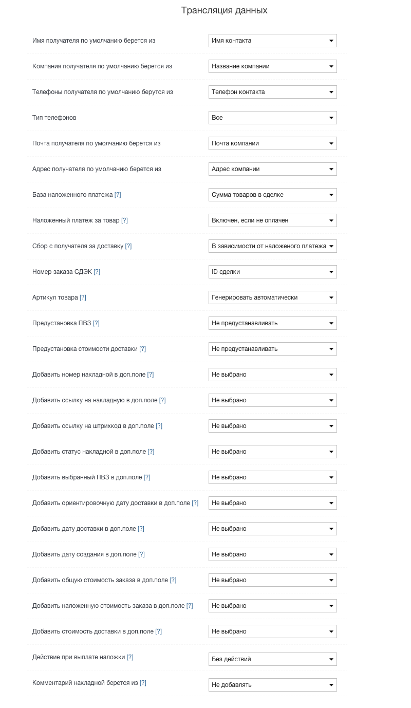 Опция позволяет транслировать ссылку на штрихкод места СДЭК в доп. поле сделки. При повторном создании накладной для одного и того же документа, ссылка будет заменена новой.
