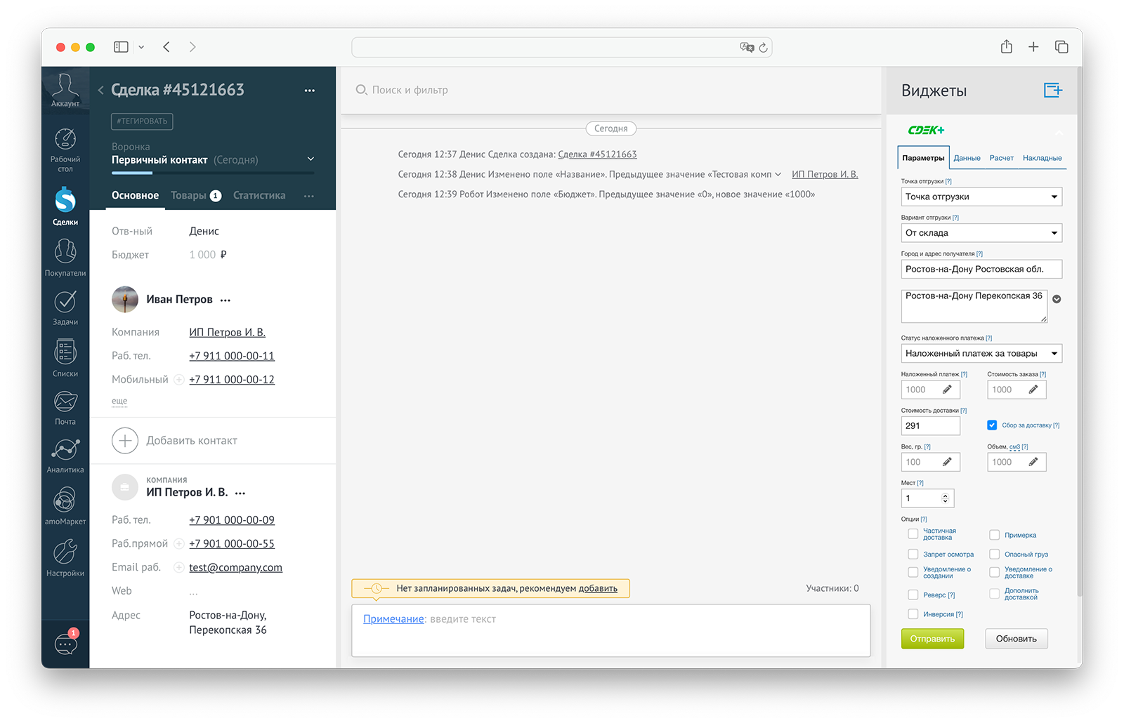 Виджет приложения реализует интерфейс редактирования данных заказа, создание накладных СДЭК, просмотр уже созданных накладных по документу.