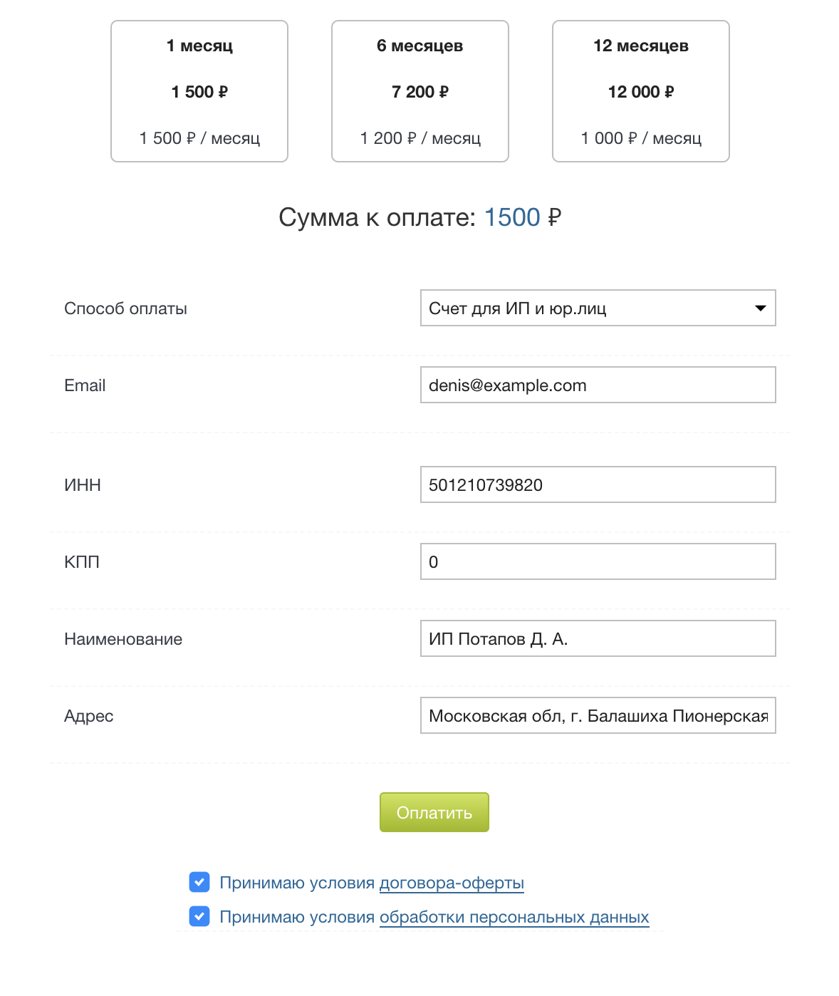 Для выставления счета: укажите электронную почту, ИНН, КПП (если нет - 0), наименование компании и юридический адрес