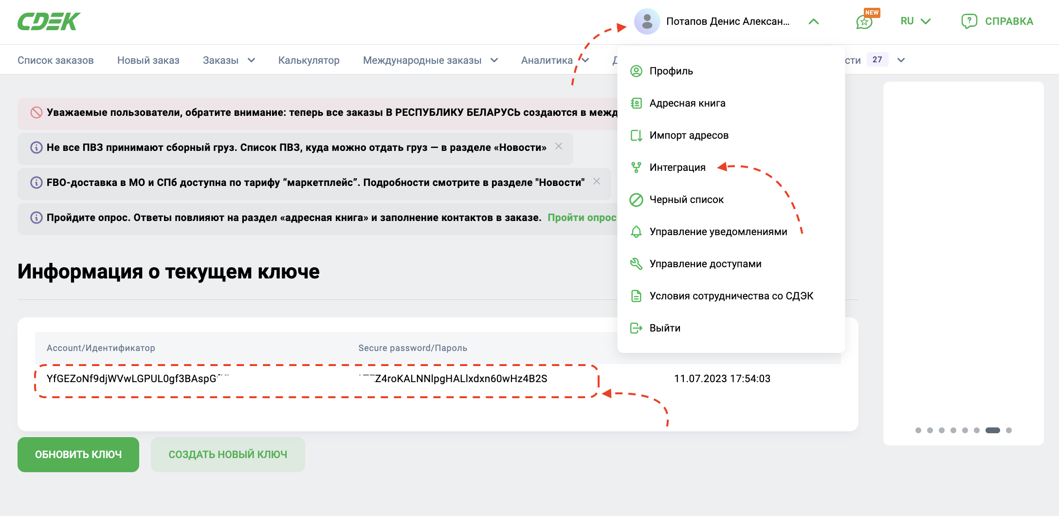 Для работы приложения потребуются ключи API СДЭК. Получить ключи можно в личном кабинете СДЭК.